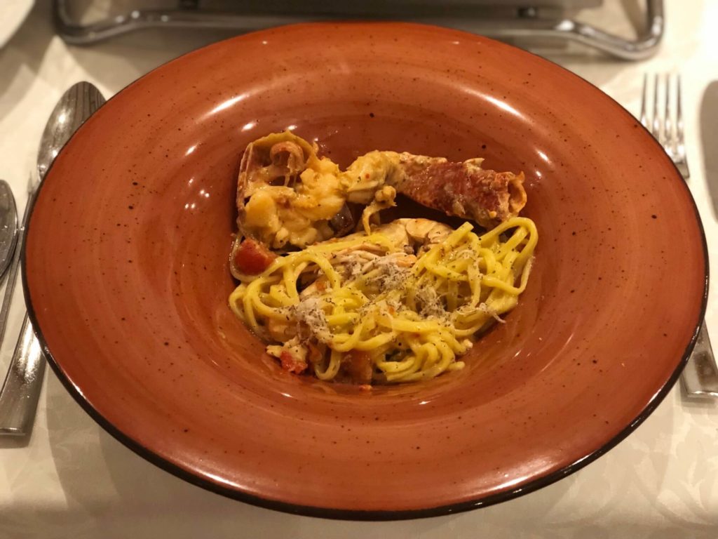 Prvo jedemo jastoga sa domaćom testeninom i tartufima ( rod gljiva iz porodice Tuberaceae )! Tartufi su najskuplje jestive gljive na svetu koje se koriste kao dodatak i slanim i slatkim jelima i imaju prepoznatljiv oštar miris i ukus. Tartufi su moćan afrodizijak! Italijanski naučnici su dokazali da u tartufima ima feromona – hemijskih supstanci koje izlučuje ljudsko telo, a koji podstiču seksualnu aktivnost. Prijatno vam uživanje!