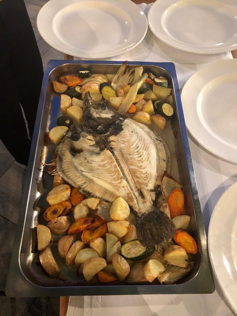 Riba San Pjer (Kovač) pečena sa krompirom i povrćem u rerni. Topi se u ustima!