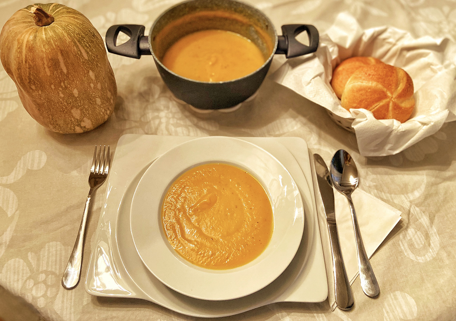 Iseći bundevu na kockice i staviti u šerpu i uliti 3 šolje vode. Staviti kocku od povrća i dodati začine ( morska so, biber, beli luk u prahu i peršun ). Kuvati oko 30. minuta. Zatim skloniti šerpu sa ringle, uzeti blender i izpasirati bundevu dok smesa u šerpi ne postane skroz kašasta.